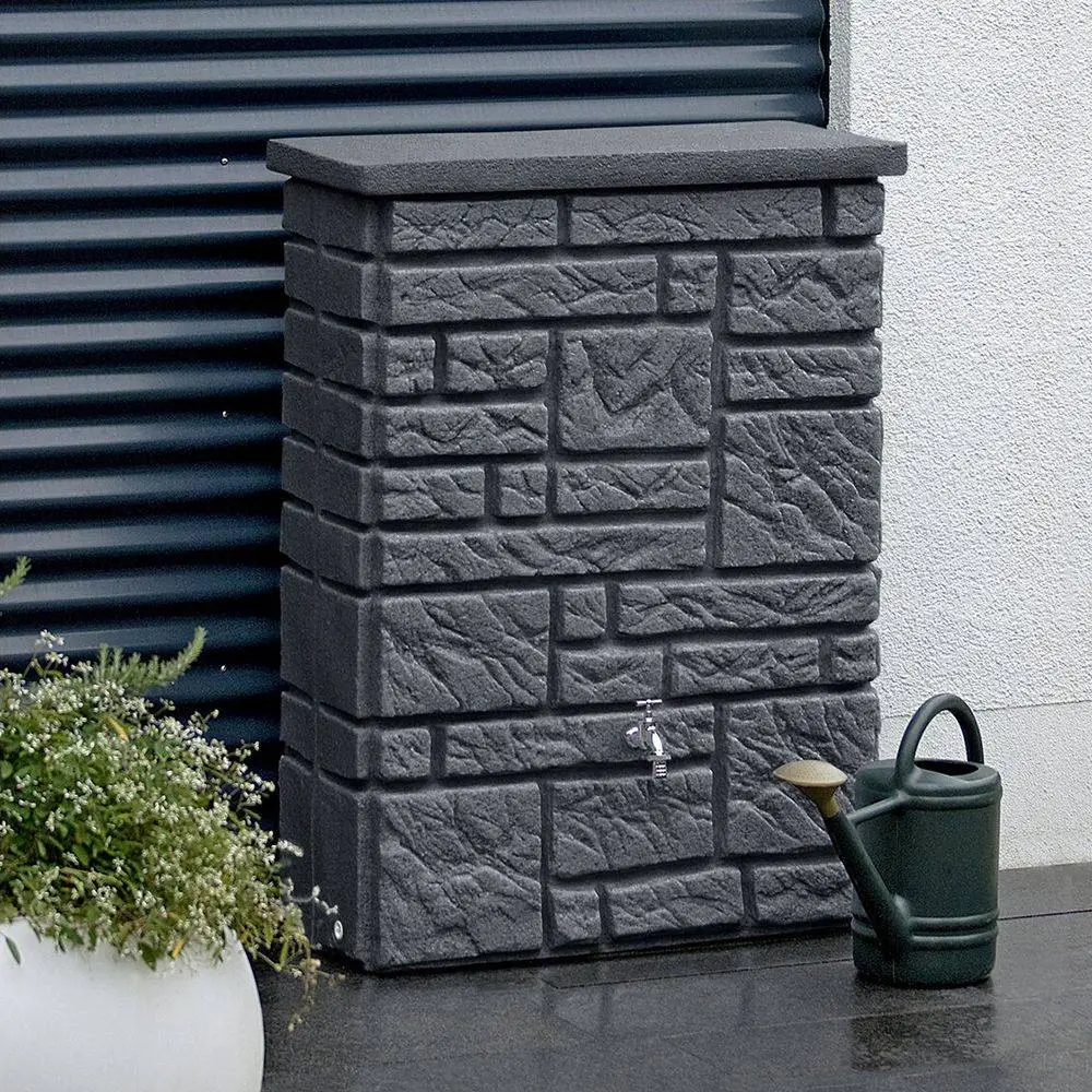 This 300L Maurano Stone Effect Water Butt in Charcoal has an authentic stonewall effect appearance and includes a lid, chrome tap and wall-fixing bracket.