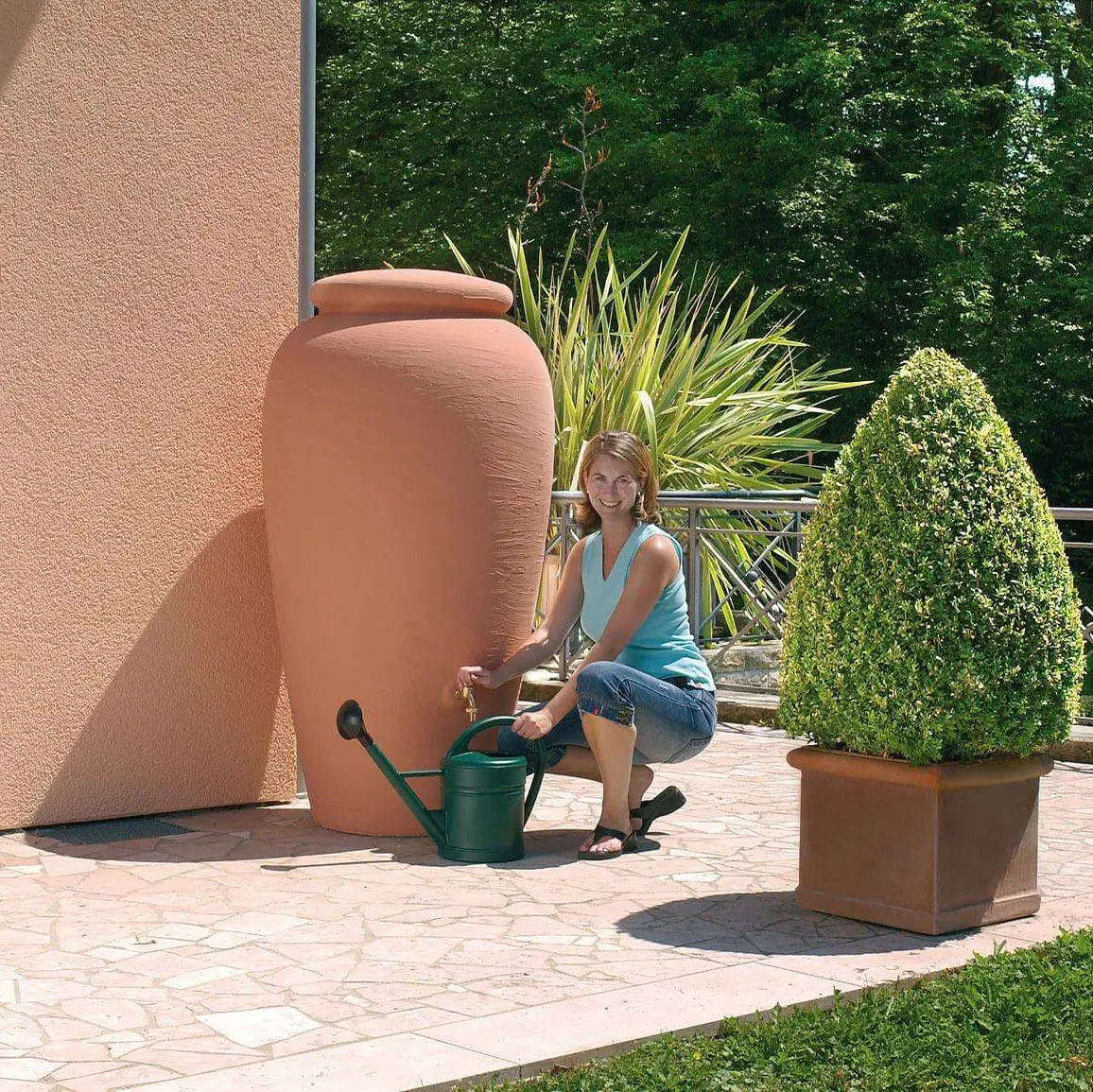The decorative 300L Rainwater Amphora Water Butt made from platic, is a Mediterranean-style rainwater tank with a large capacity and small footprint. It has a large storage volume with little space requirement and these water butts are UV-stable and weather resistant.