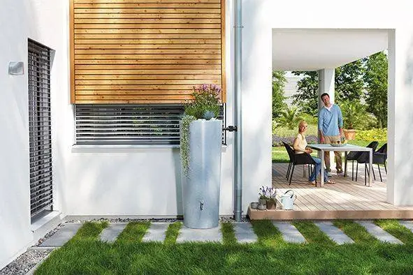 This 350L Gabbro Stone Effect 2 IN 1 Water Tank – Silver Stone is elegant and has a built-in planter so you can store and water garden plants in the top. You can grow a wide variety of plants in the planter and this conical-shaped water butt also includes a chrome tap.
