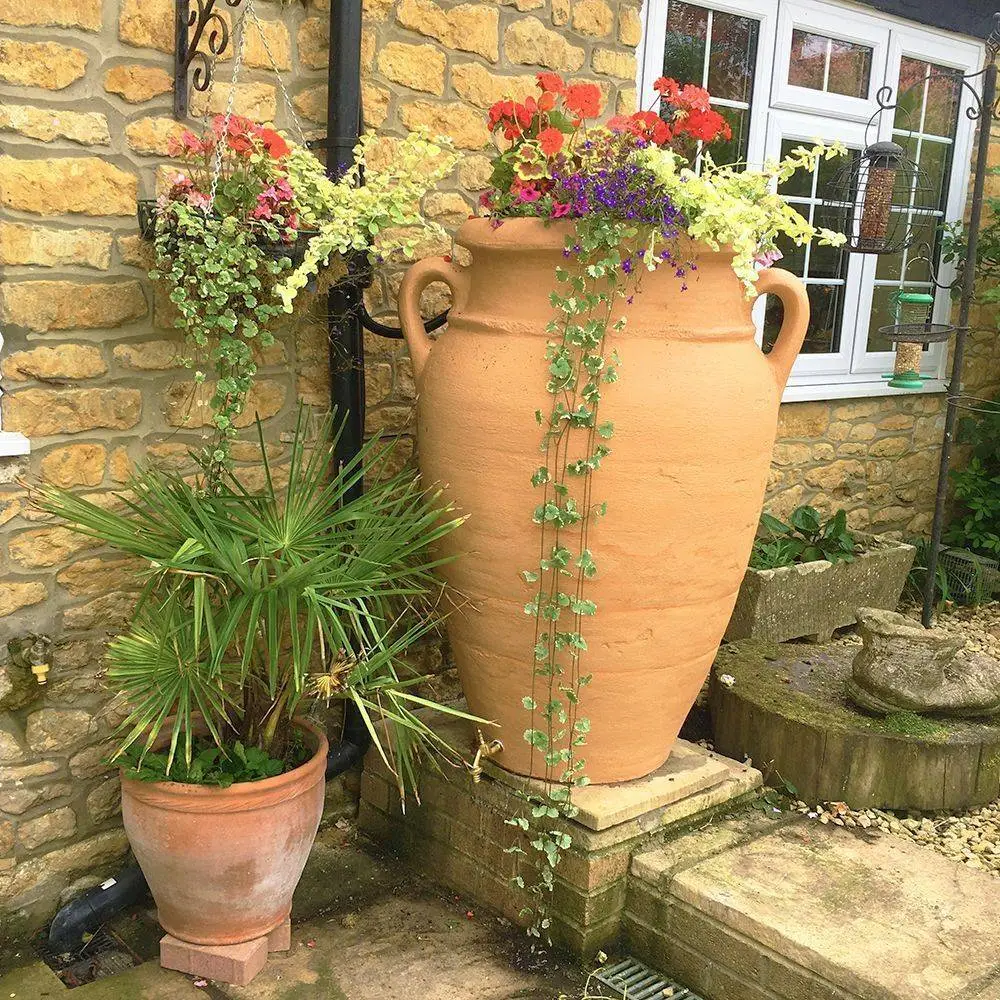 Add a Mediterranean flavour to your garden with this 600L Antique Amphora Water Butt – Terracotta Effect which includes a planter and plant fleece. This water butt has highly elaborate details and is both UV-stable and weather resistant. It also comes with a brass tap as well as a pre-fitted inlet seal and threaded connection for tap, so no need for drilling. Downpipe is not included but can be bought as an optional extra. Dimensions: Height: 142cm (56 inches) Diameter: 92cm (36 inches) Width with handles: 104cm (41 inches) Weight: 30kg Capacity: 600 Litres (132 UK Gallons)Â