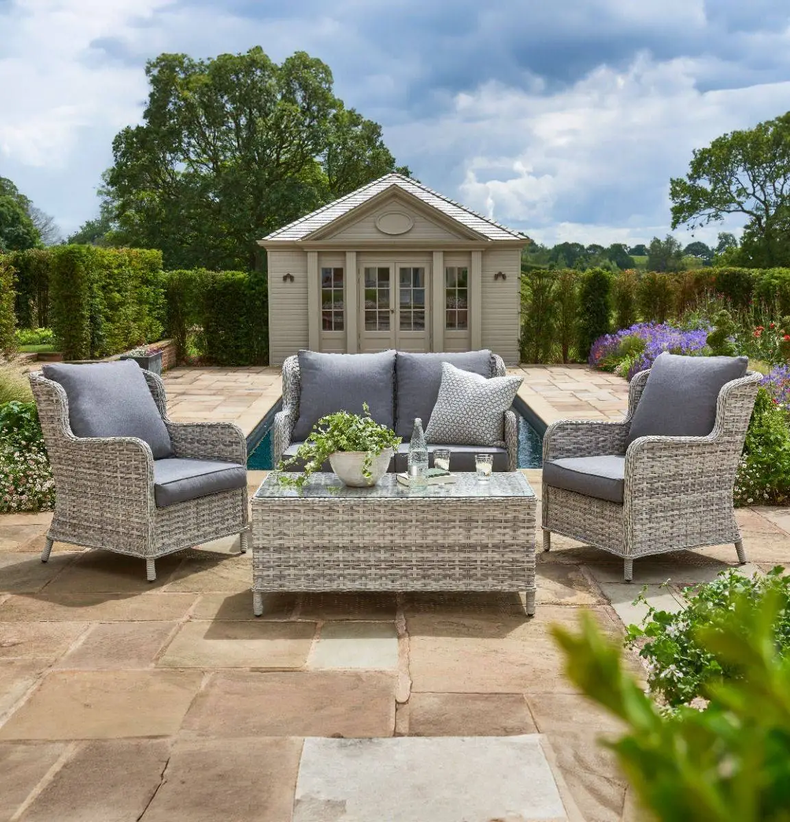 Enhance your outdoor space with the Handpicked Wroxham 4 Seat Lounge Set – a stylish and functional ensemble. This set comprises a 2 Seat Sofa, 2 Lounge Chairs, and a Glass Topped Coffee Table. The chairs are constructed using sturdy Rattan material that offers unparalleled durability and can withstand the harmful effects of UV rays and moisture.
